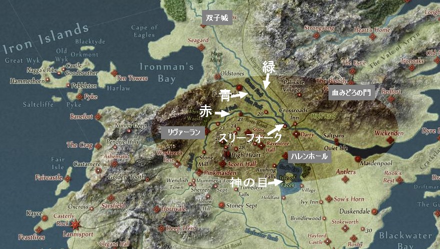 映像でその黒曜石の壁が生じる地点を地図上で示すと、リヴァーラン、谷間からハレンホール辺りなんですね。