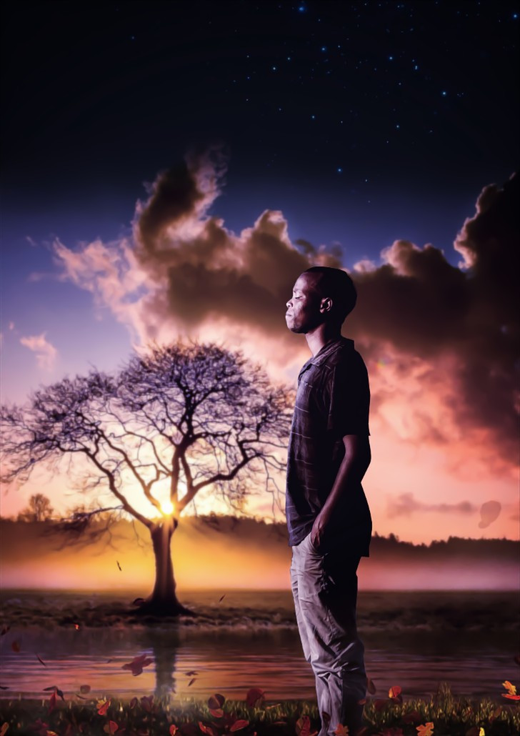 この画像の風景画の上の部分は、星空の画像を使って足しています。