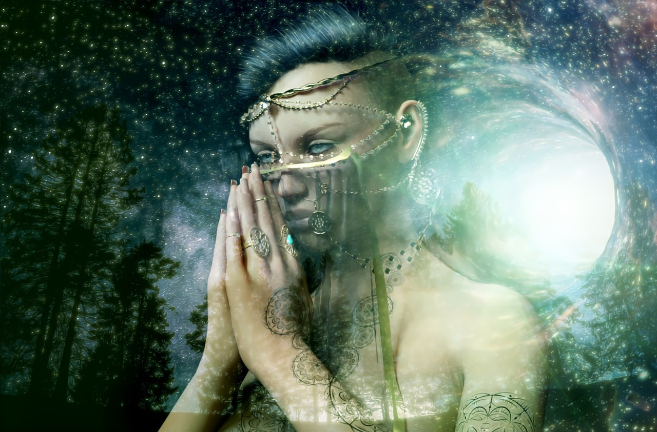 上の人物画像(3DCGですが)を見た時、宇宙的規模のスピリチュアルをイメージしました。ただ、どう表現するかで悩んで音楽を聴きました。