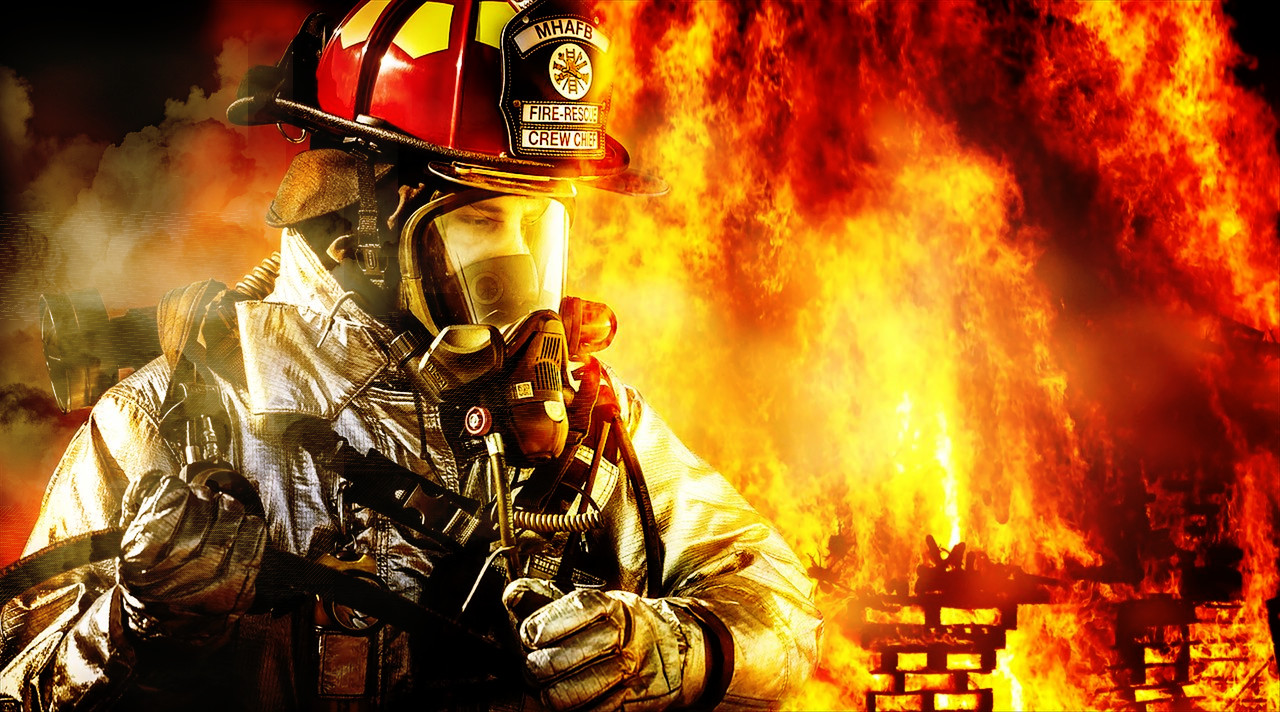 炎はずっと後方にありますので、消防士は炎に照らされてる状態ではありません。