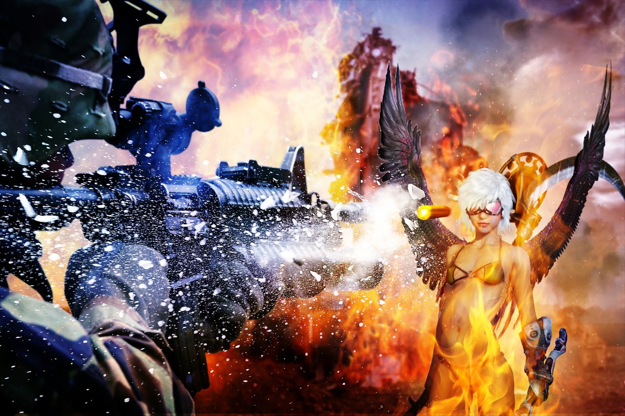 上の画像はその女性キャラだけが3Dデジタルアートです。デビルっぽい羽をつけました。